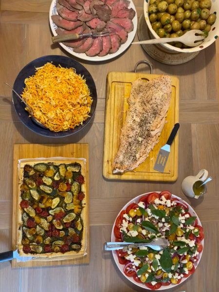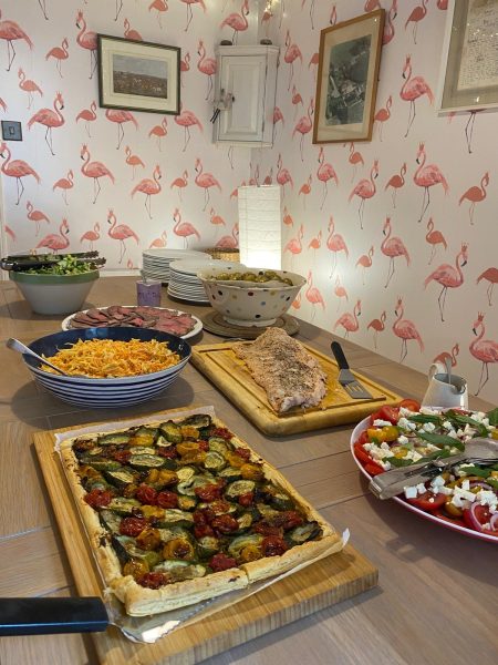 In July I did a joint 80th birthday party for a couple heavily associated with both the Kent Gardens Trust and the National Garden Scheme, which was a 3-course sit down lunch. They had twice-baked cheese soufflés on dressed baby leaves; hot-smoked trout, goat’s cheese, pea and fennel salad with new potatoes; and lemon tart and summer pudding for dessert. There were 46 guests seated at 6 tables in the couple’s beautiful garden and it was especially memorable because the heavens opened during the main course and everyone had to briefly abandon their seats and head for cover!